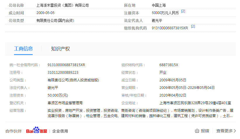 2. 上海派米雷投资(集团)有限公司 .工商局官网[引用日期2019-12-13]